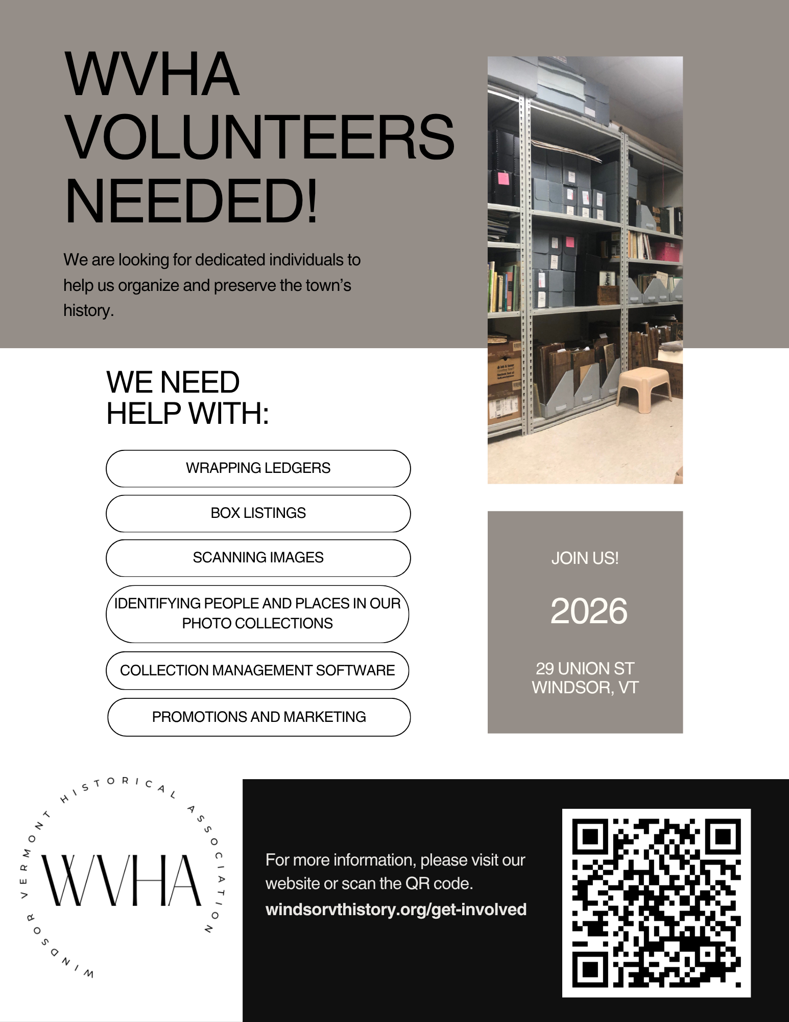 The Windsor Vermont Historical Association actively seeks materials (e.g. Artifacts, Historical Documents and Photographs) about Windsor and welcomes donations of appropriate items pertaining to the history of Windsor. Though our storage space is limited, our Collections Committee would be happy to consider materials that you wish to donate, and for those that we are able to accept, we will ensure that they are protected and preserved in perpetuity.